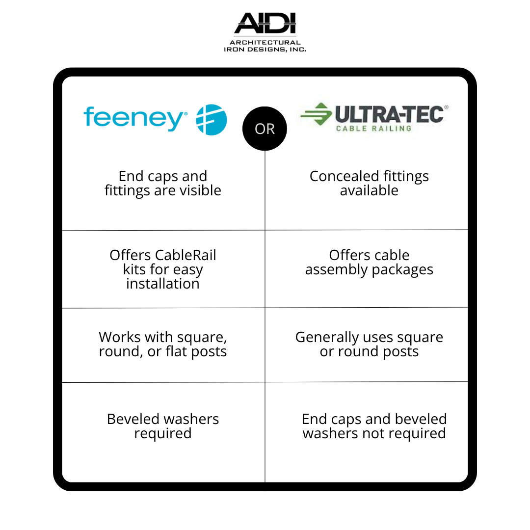 We carry the top two brands of cable rail infill systems: Feeney and Ultra-Tec. Between the two brands, you have a number of options for cable sizes and fittings for just about any application.